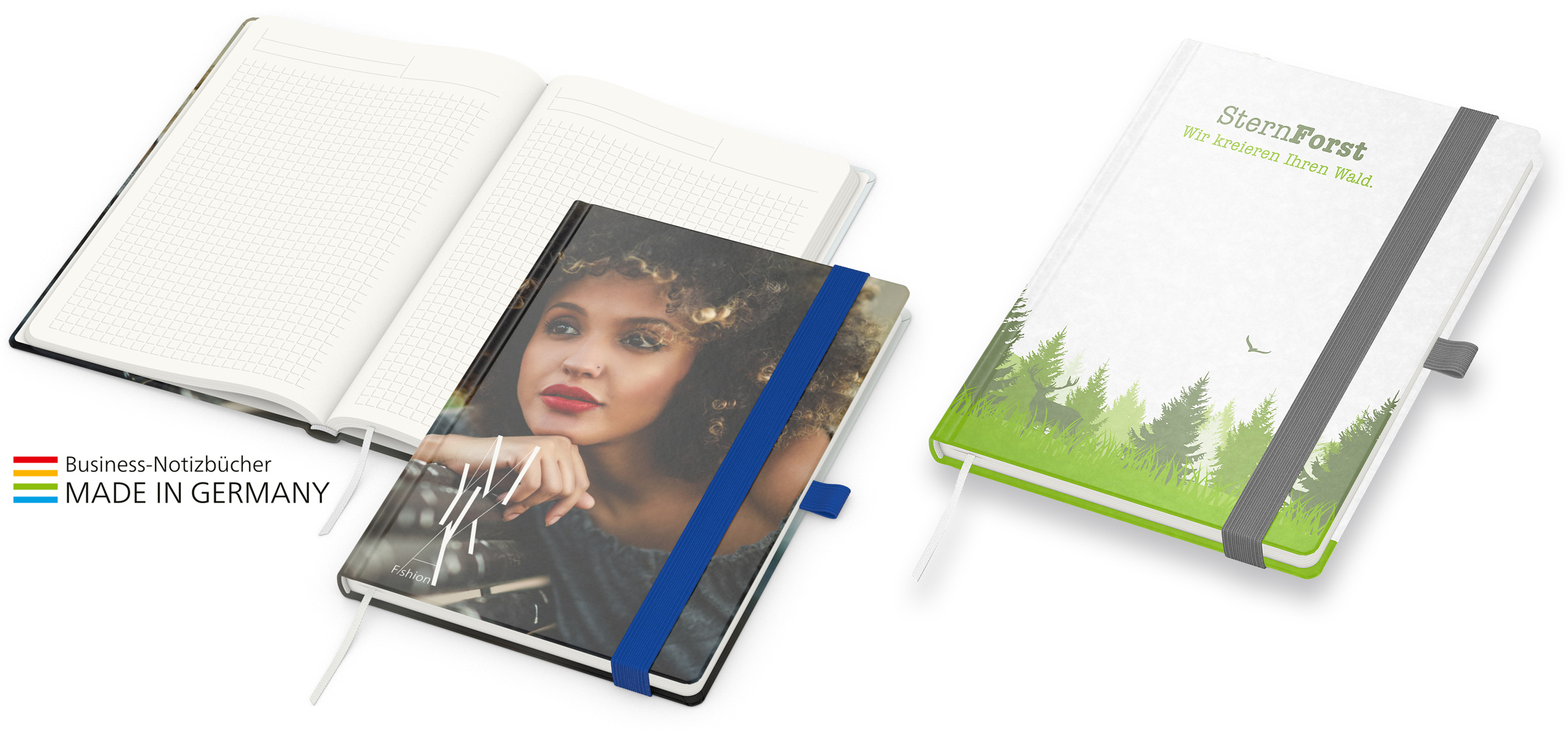 mit 192 Seiten Recyclingpapier mit Umweltzeichen „Blauer Engel“, mit Winkelkaro und Mikroperforation, Gummiband und Stiftschlaufe in einer von 8 Farben, Einstecktasche, Lesezeichen, Kapitalband, runder Rücken