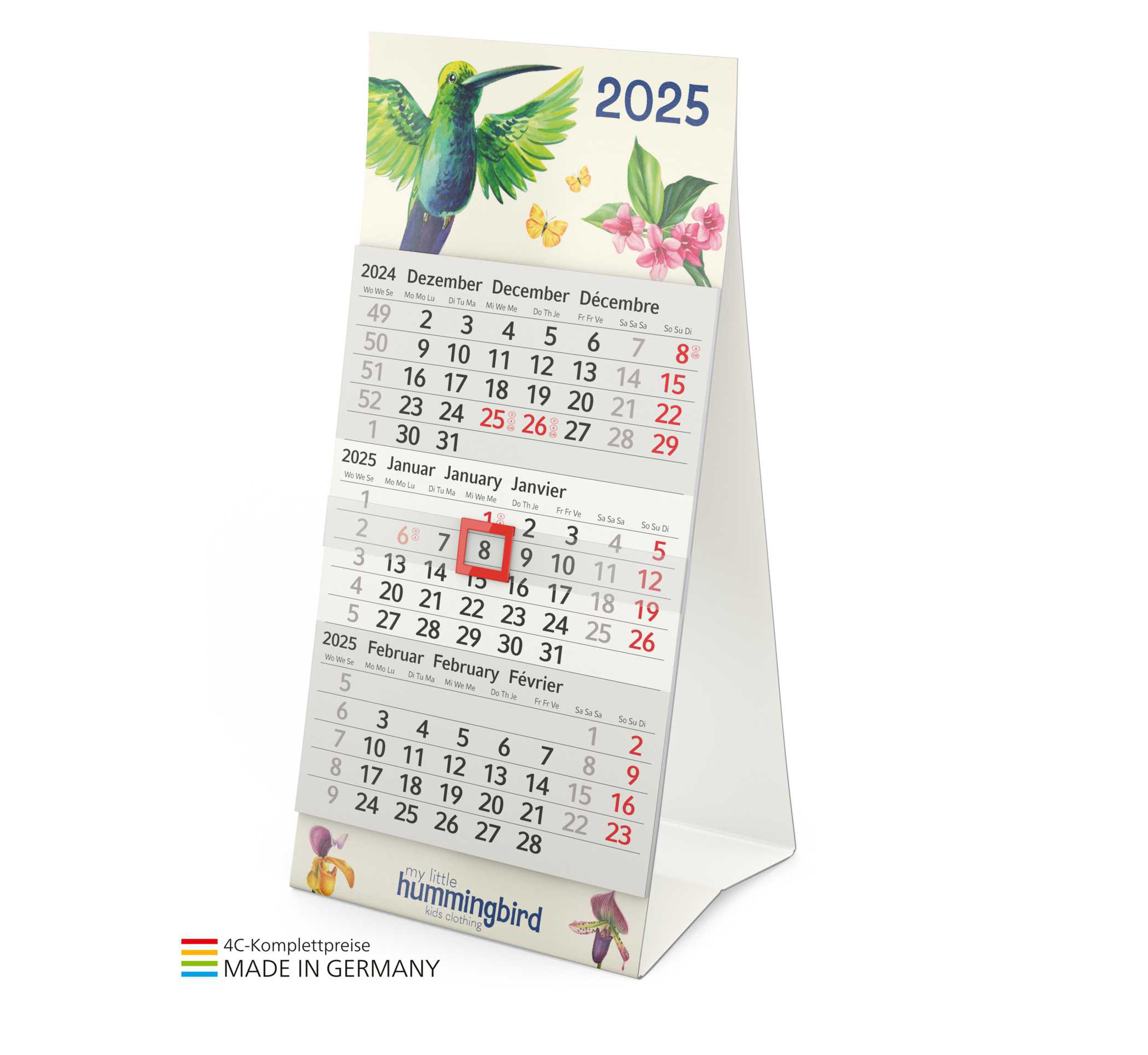 Der Tischkalender bietet gleich drei Werbeflächen: eine am Kopf, eine am Fuß und eine auf der kompletten Rückseite. Das 3-Monatskalendarium besteht zu 100 % aus Altpapier mit dem Umweltzeichen „Blauer Engel“. Mit seiner dreieckigen Dachformat-Faltung aus Karton einfach aufstellbar und vorher durch seine flache Form ideal zum Postversand geeignet.